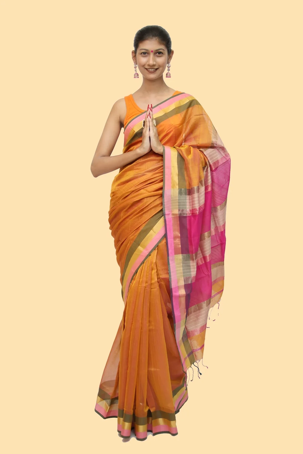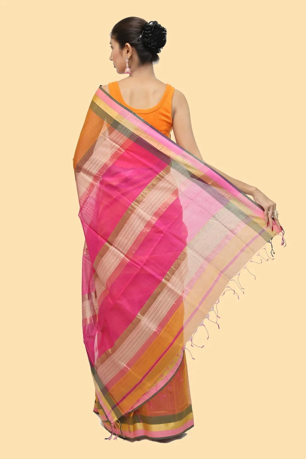 Imperial Maheshwari handloom Tissue Saree with Tassels – Beige