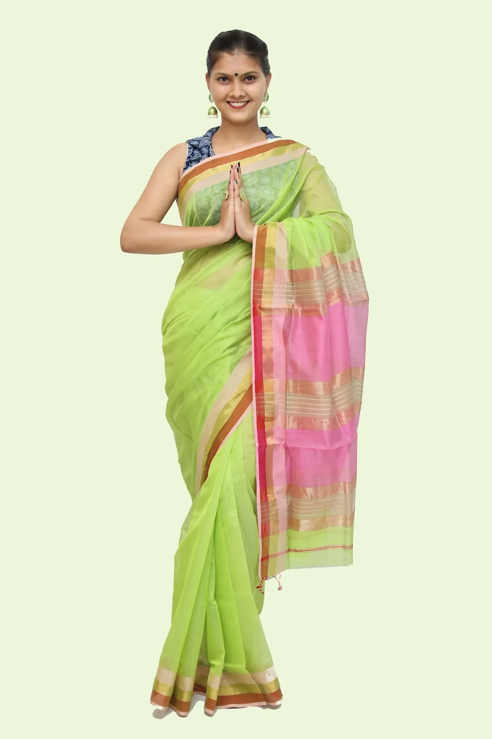 Epic Ivory Kosa Pallu Parrot Green handloom Saree with Tassels