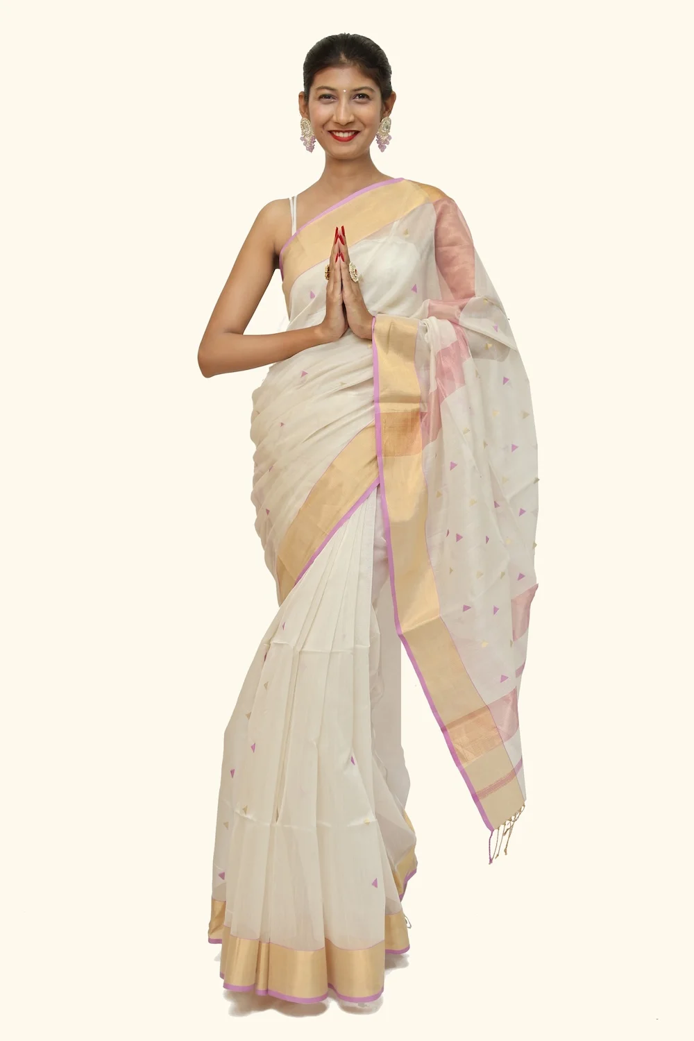 Heavenly White Purple Zari Borcade handloom Saree with Tassels