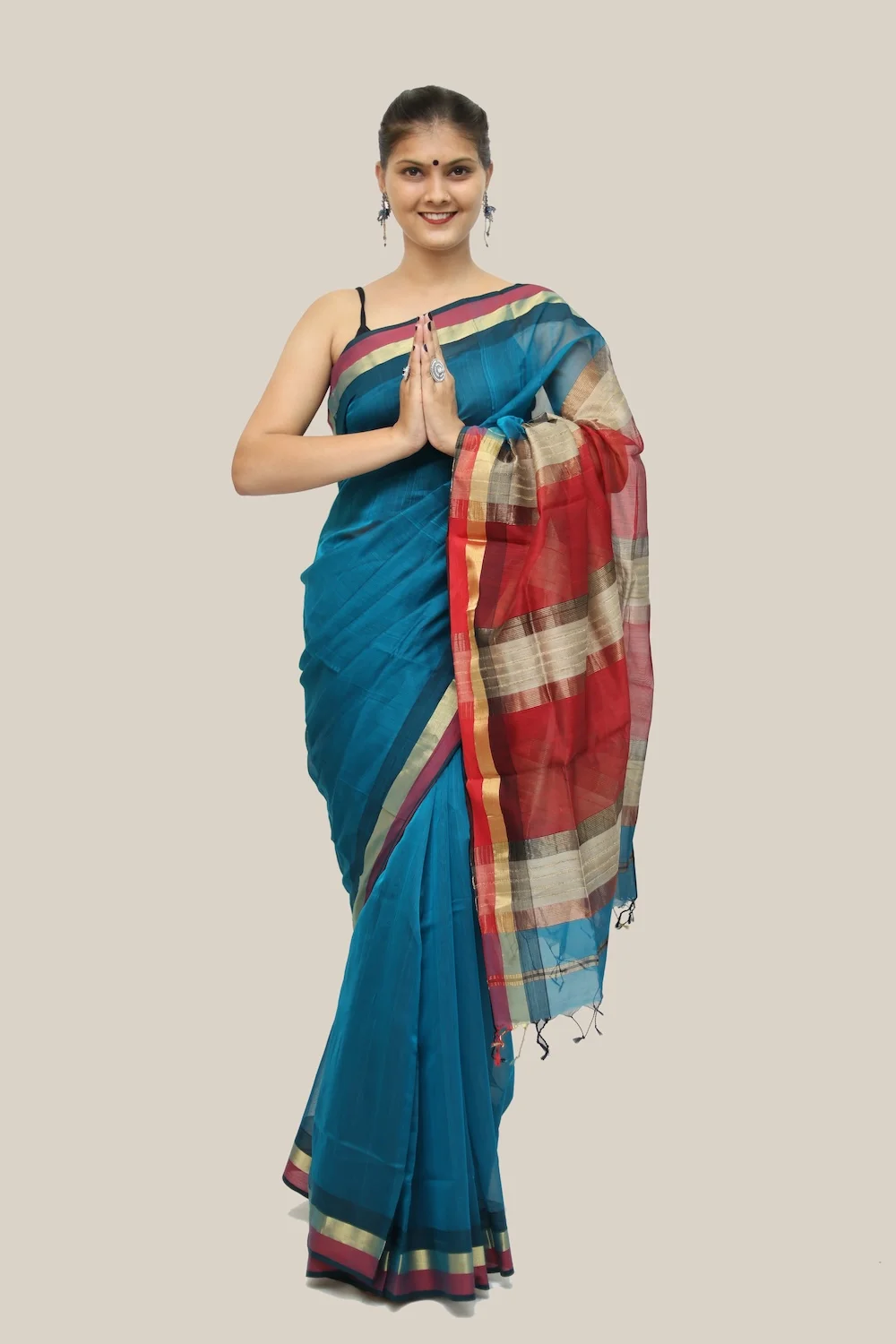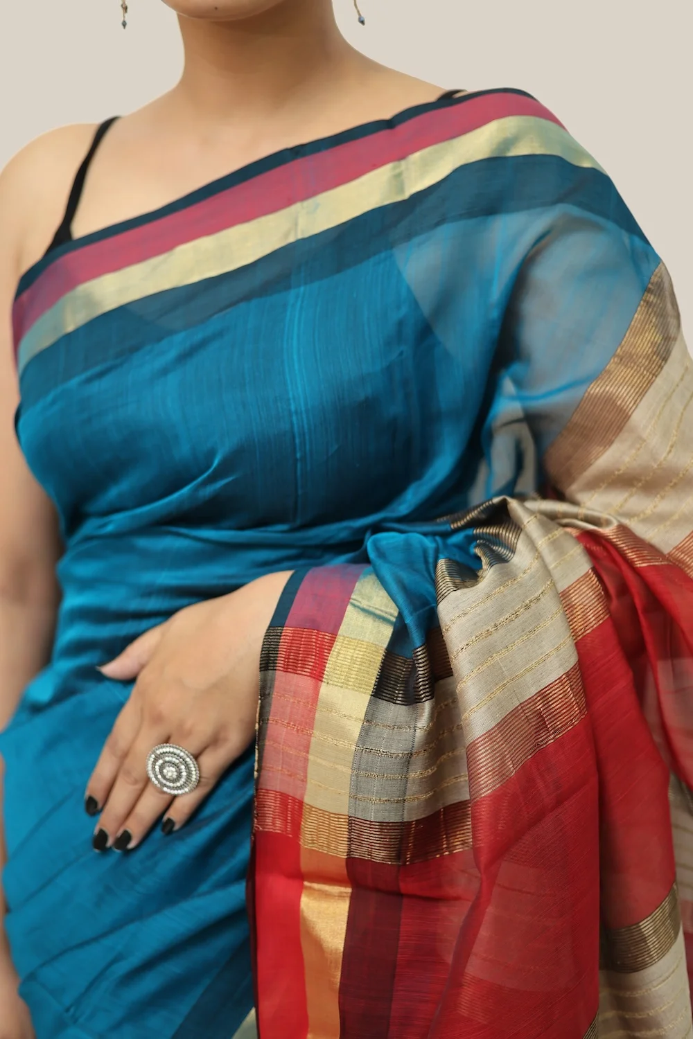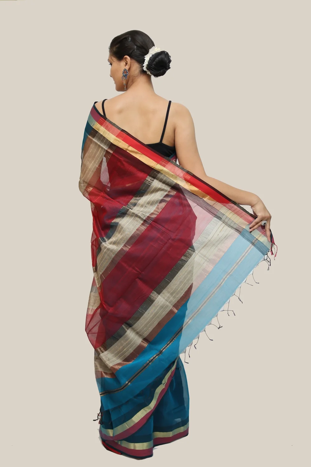 Legacy Kosa Pallu Mystic Blue Red handloom Saree with Tassels