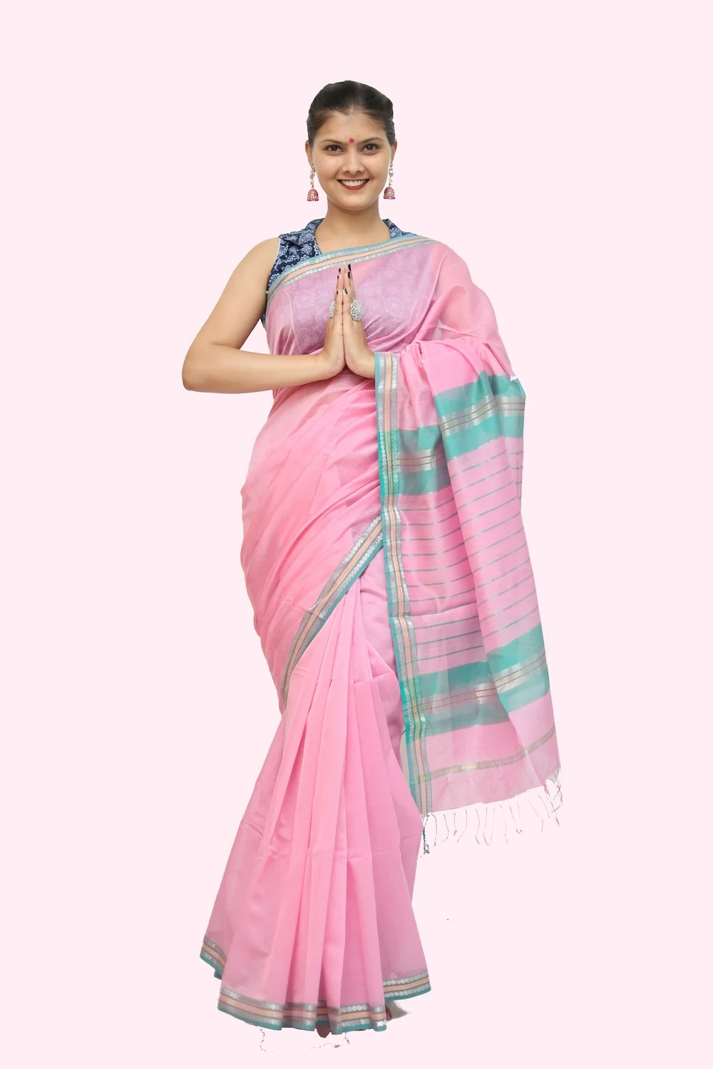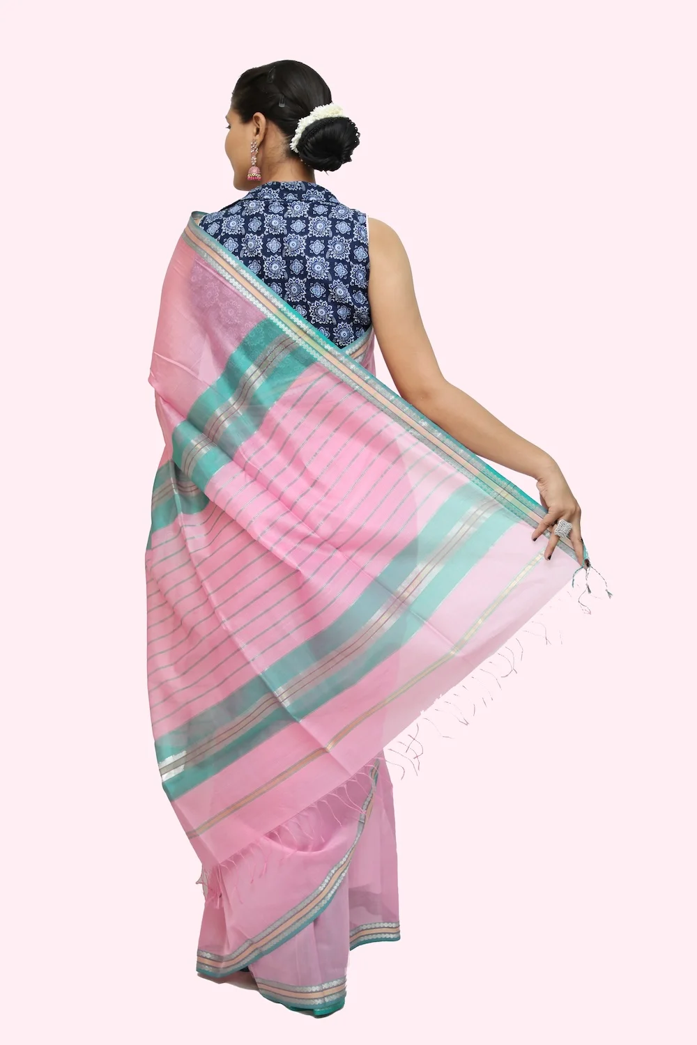 Imperial Maheshwari handloom Tissue Saree with Tassels – Pastel Pink