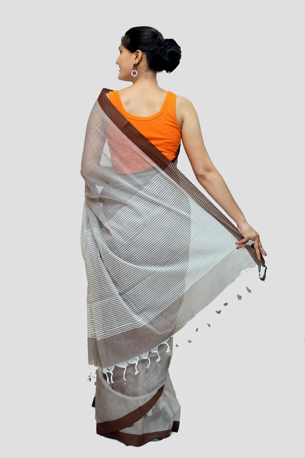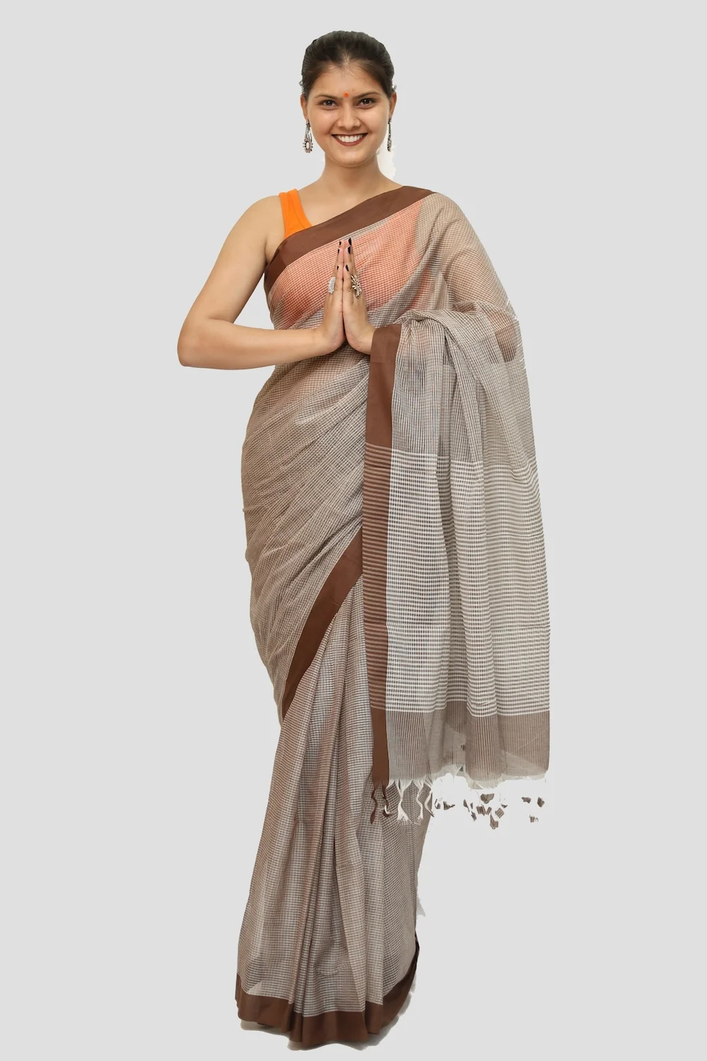 Trendy Cotton Checkerd handloom Saree with Tassels – Coffee