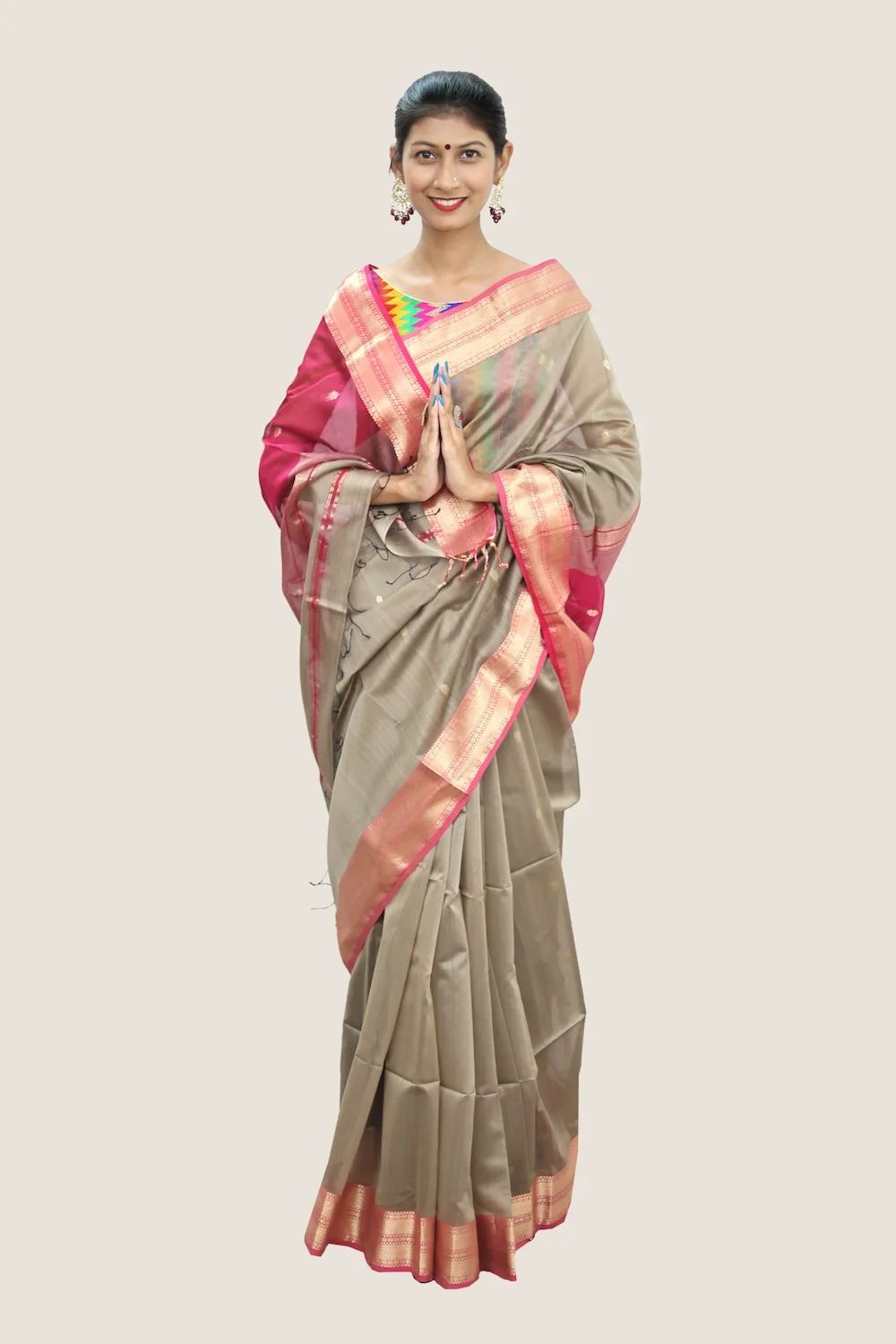 Imperial Maheshwari handloom Tissue Saree with Tassels – Beige