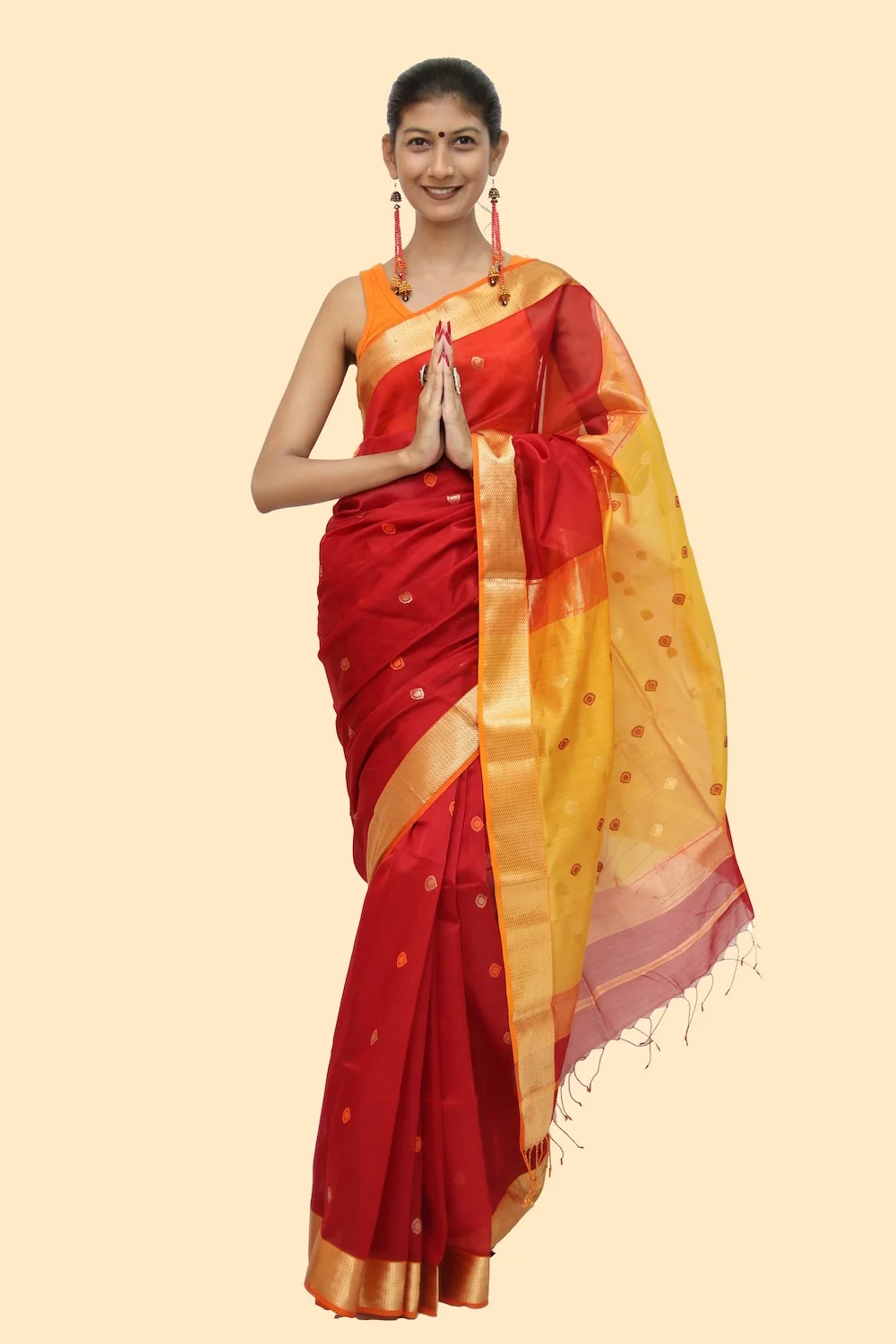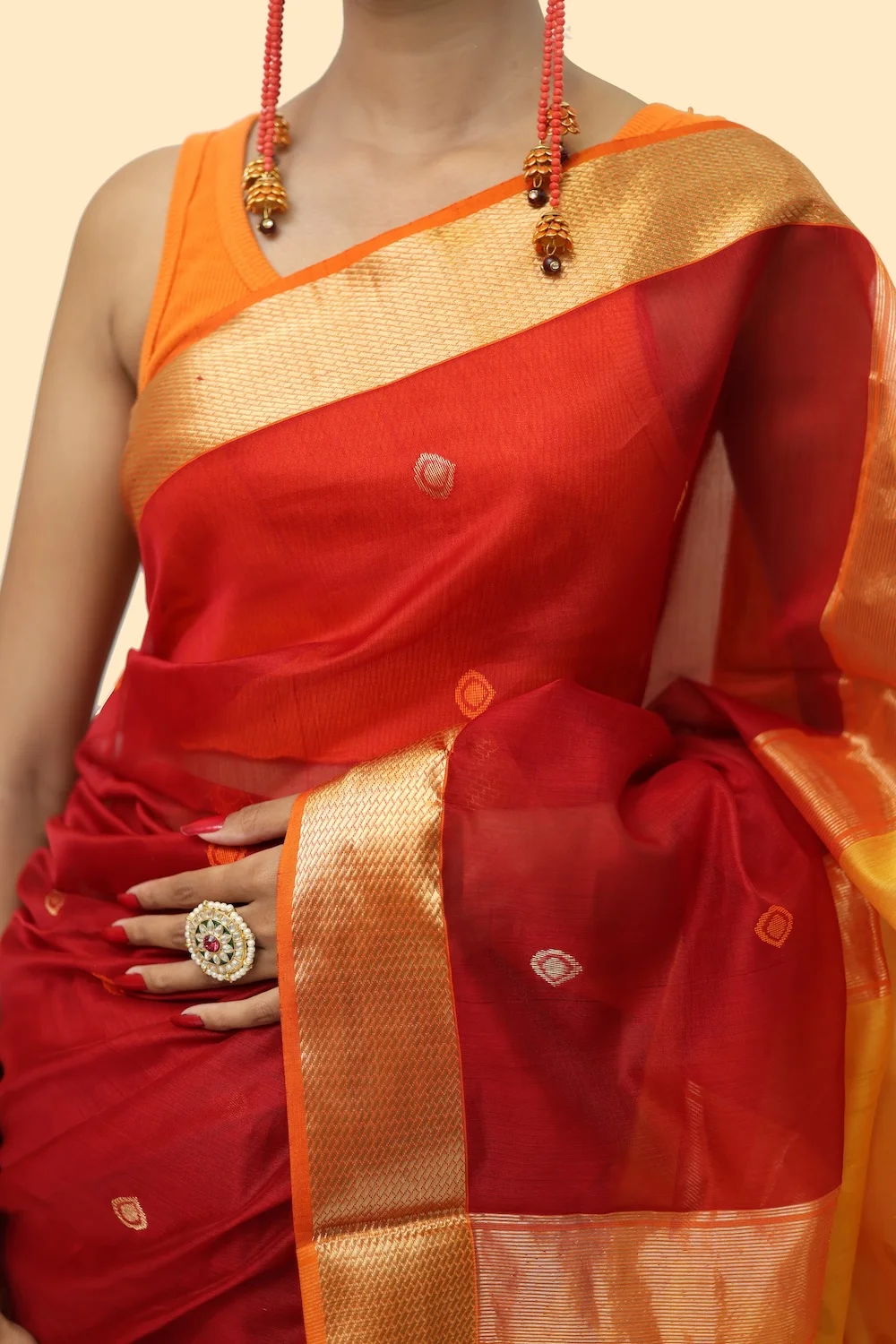 Imperial Maheshwari handloom Tissue Saree with Tassels – Red