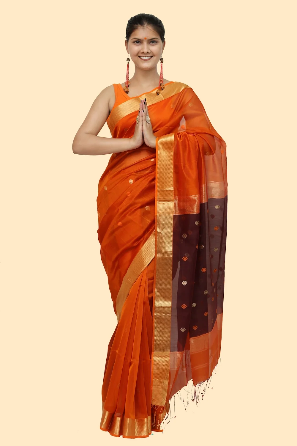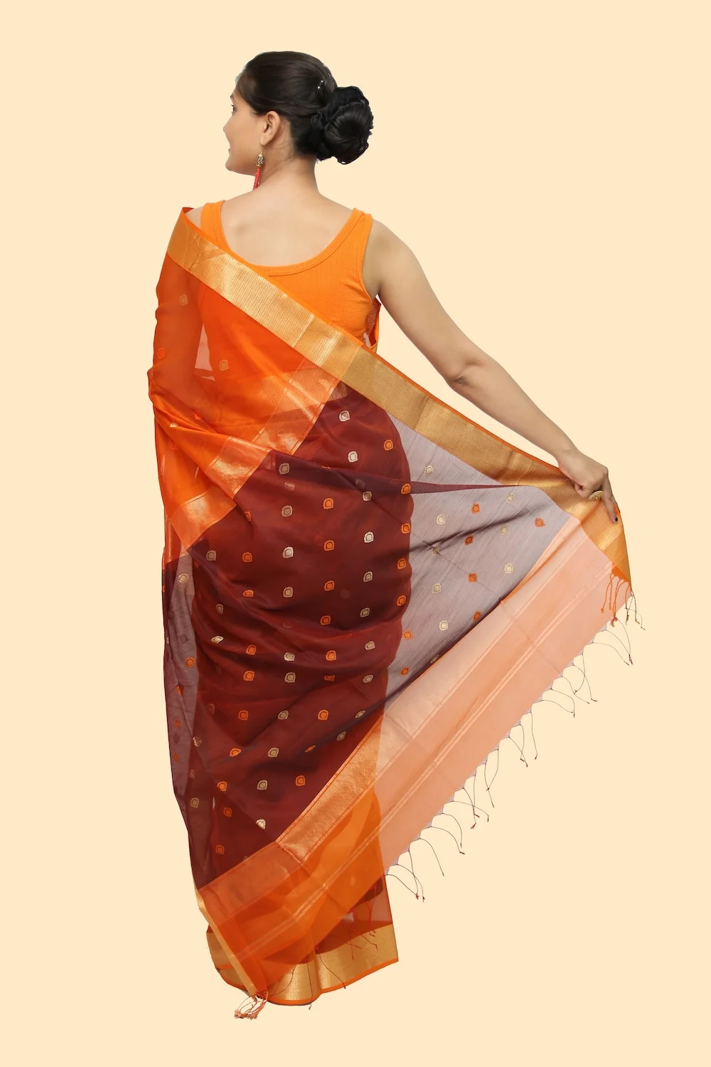 Vibrant Orange Drop motif handloom Saree with Tassels